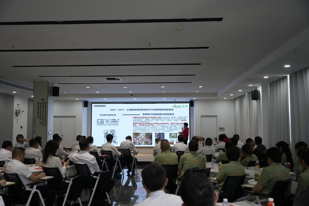參觀結(jié)束后,眾人齊聚會議室,參加由金曄食品創(chuàng)始人李金倫主講的學(xué)習(xí)交流會。在分享中,李總以“回歸原點創(chuàng)造美好”為主題,結(jié)合金曄的成長故事,深入闡釋了企業(yè)如何將稻盛經(jīng)營學(xué)融入日常經(jīng)營,如何把“敬天愛人”的理念落地生根,深入淺出地分析了當(dāng)前食品行業(yè)的發(fā)展趨勢和挑戰(zhàn),并分享了企業(yè)如何在市場競爭中堅守初心、不斷創(chuàng)新的重要性。他講到,回歸原點就是回歸簡單純粹和真誠善良,人生和經(jīng)營的成功無非是回歸原點的行動。他強調(diào),企業(yè)需將哲學(xué)思維(如稻盛和夫理念)與實戰(zhàn)管理(如華為流程優(yōu)化)融合,形成獨特的經(jīng)營體系。他還提出用戶導(dǎo)向,通過“空椅子”機制讓用戶虛擬參與決策,分歧時優(yōu)先遵循用戶立場;首創(chuàng)無添加山楂制品,以包裝革新(自立袋、拉鏈設(shè)計)提升體驗;拆分職能部門為“傳統(tǒng)+現(xiàn)場”雙線,推行阿米巴模式激發(fā)團隊自主性。李總對企業(yè)使命的解讀、對員工關(guān)懷的重視、對讀書學(xué)習(xí)的熱愛和感受,以其豐富的經(jīng)驗和獨到的見解,讓與會者深受啟發(fā),進一步認識到企業(yè)文化與價值觀在企業(yè)發(fā)展中的核心作用。