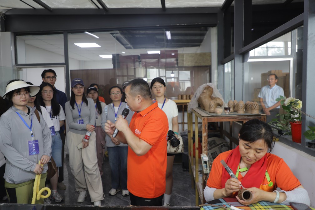 龍格黑陶藝術研究院內,傳統(tǒng)工藝與現(xiàn)代創(chuàng)新的完美融合。省級非物質文化遺產(chǎn)項目代表性傳承人徐慶增老師帶領師生們參觀黑陶生產(chǎn)車間,他特別提到,濟陽黑陶以黃河泥為原料,經(jīng)選土、拉坯、雕刻、燒制等20余道工序制成,其“黑如漆、亮如鏡”的獨特質感源于高溫窯變的自然反應。現(xiàn)場演示了拉坯、雕刻技藝,手中的陶土仿佛被賦予了生命,在指尖的舞動下逐漸成型。師生們在專業(yè)藝人的指導下,從揉泥、拉坯到成型,親自體驗了黑陶的制作,最終創(chuàng)作出了屬于自己的黑陶作品。