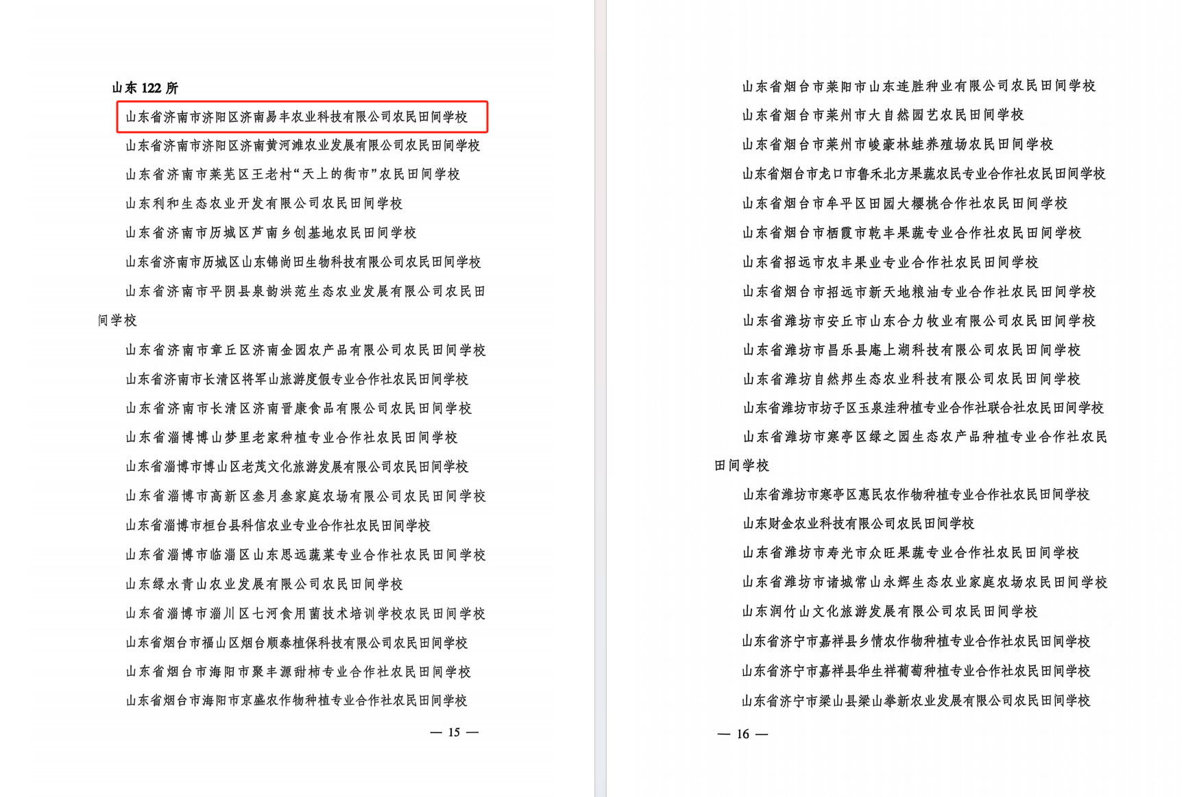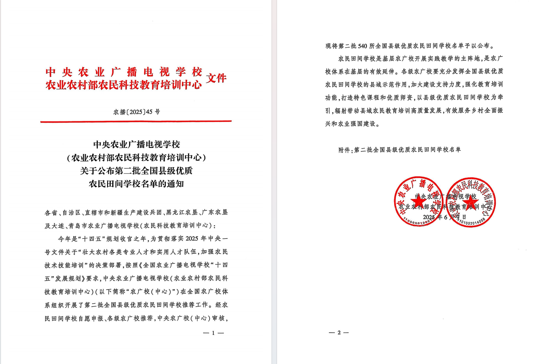2025年6月9日,中央農(nóng)業(yè)廣播電視學(xué)校(農(nóng)業(yè)農(nóng)村部農(nóng)民科技教育培訓(xùn)中心)公布了“第二批全國縣級(jí)優(yōu)質(zhì)農(nóng)民田間學(xué)校名單”。濟(jì)南易豐農(nóng)業(yè)科技有限公司農(nóng)民田間學(xué)校,榮耀上榜,榮獲國家級(jí)殊榮!